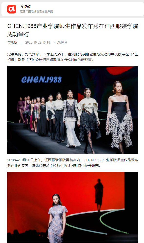 霓裳宫内,灯光渐暗,一束追光落下,建筑般的硬朗轮廓与流动的柔美线条在T台上相遇,刚柔并济的设计语言娓娓道来当代时尚的新叙事。2025年10月20日上午,江西服装学院霓裳宫内,CHEN.1988产业学院师生作品发布秀在业内专家、媒体代表及全校师生的共同期待中拉开帷幕。