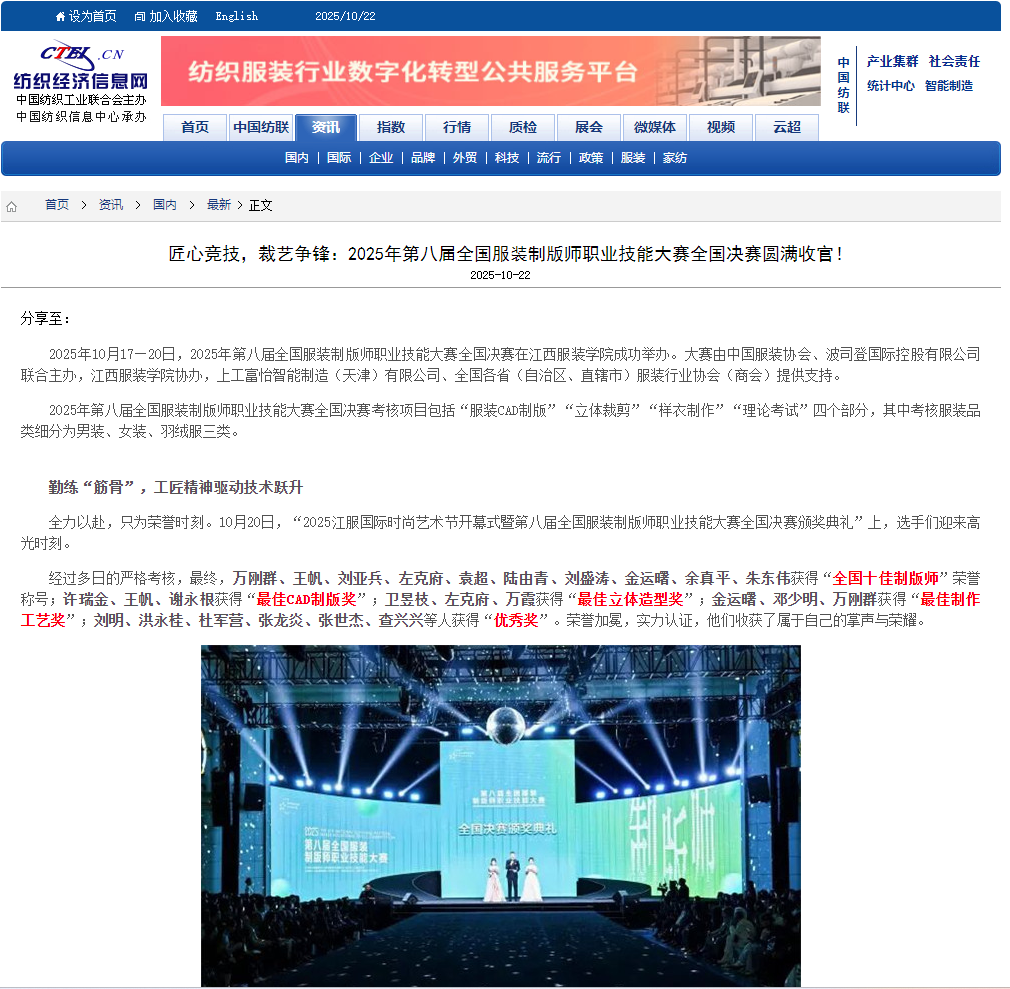 2025年10月17—20日,2025年第八届全国服装制版师职业技能大赛全国决赛在江西服装学院成功举办。大赛由中国服装协会、波司登国际控股有限公司联合主办,江西服装学院协办,上工富怡智能制造(天津)有限公司、全国各省(自治区、直辖市)服装行业协会(商会)提供支持。2025年第八届全国服装制版师职业技能大赛全国决赛考核项目包括“服装CAD制版”“立体裁剪”“样衣制作”“理论考试”四个部分,其中考核服装品类细分为男装、女装、羽绒服三类。