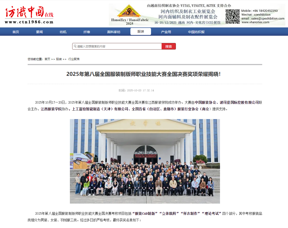 2025年10月17—20日,2025年第八届全国服装制版师职业技能大赛全国决赛在江西服装学院成功举办。大赛由中国服装协会、波司登国际控股有限公司联合主办,江西服装学院协办,上工富怡智能制造(天津)有限公司、全国各省(自治区、直辖市)服装行业协会(商会)提供支持。2025年第八届全国服装制版师职业技能大赛全国决赛考核项目包括“服装CAD制版”“立体裁剪”“样衣制作”“理论考试”四个部分,其中考核服装品类细分为男装、女装、羽绒服三类。