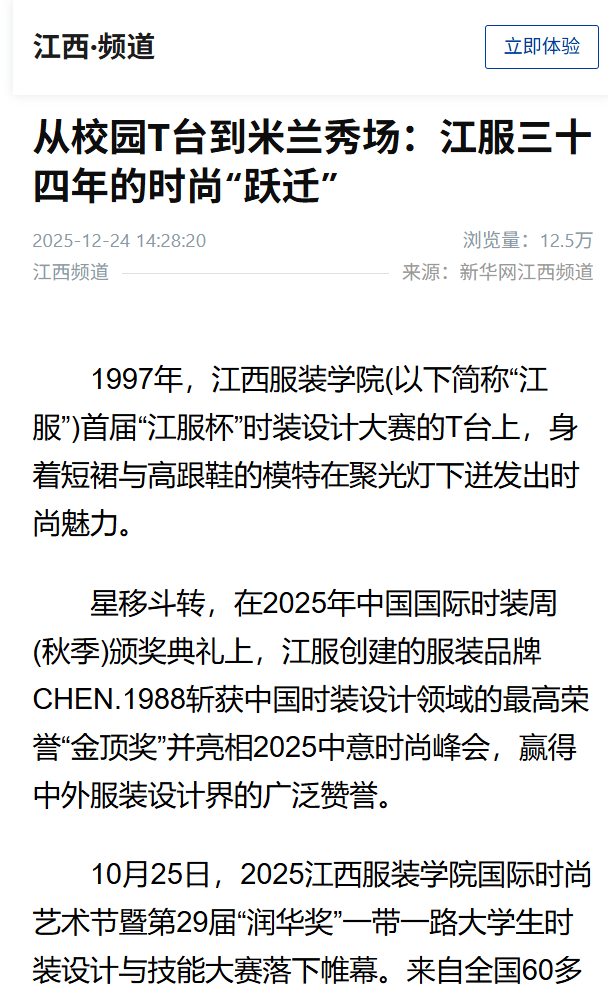 1997年,江西服装学院(以下简称“江服”)首届“江服杯”时装设计大赛的T台上,身着短裙与高跟鞋的模特在聚光灯下迸发出时尚魅力。星移斗转,在2025年中国国际时装周(秋季)颁奖典礼上,江服创建的服装品牌CHEN.1988斩获中国时装设计领域的最高荣誉“金顶奖”并亮相2025中意时尚峰会,赢得中外服装设计界的广泛赞誉。从校园T台到国际时尚殿堂,这所专注于服装领域的特色学府,走出一条服饰文化出海的时尚之路。