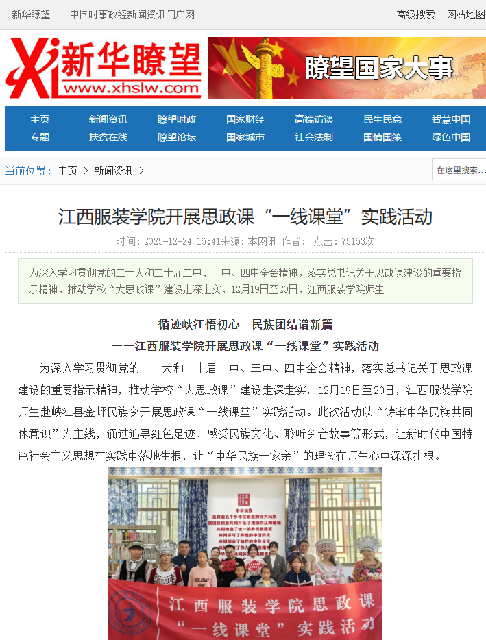 为深入学习贯彻党的二十大和二十届二中、三中、四中全会精神,落实总书记关于思政课建设的重要指示精神,推动学校“大思政课”建设走深走实,12月19日至20日,江西服装学院师生赴峡江县金坪民族乡开展思政课“一线课堂”实践活动。此次活动以“铸牢中华民族共同体意识”为主线,通过追寻红色足迹、感受民族文化、聆听乡音故事等形式,让新时代中国特色社会主义思想在实践中落地生根,让“中华民族一家亲”的理念在师生心中深深扎根。