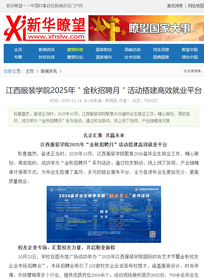 秋意盎然,奋进正当时。2025年10月,江西服装学院聚焦2026届毕业生就业工作,精心策划、周密组织,成功举办“金秋招聘月”系列活动。通过校友联动、线上线下协同、产业链精准对接等方式,为毕业生搭建了高效、多元的就业服务平台,全力促进毕业生更加充分、更高质量就业。