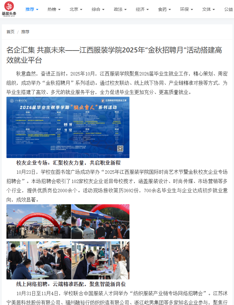 秋意盎然,奋进正当时。2025年10月,江西服装学院聚焦2026届毕业生就业工作,精心策划、周密组织,成功举办“金秋招聘月”系列活动。通过校友联动、线上线下协同、产业链精准对接等方式,为毕业生搭建了高效、多元的就业服务平台,全力促进毕业生更加充分、更高质量就业。