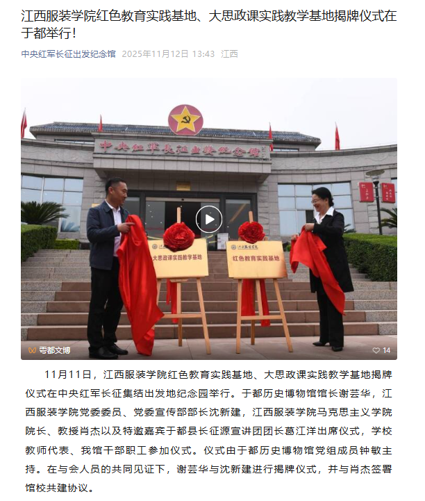 11月11日,江西服装学院红色教育实践基地、大思政课实践教学基地揭牌仪式在中央红军长征集结出发地纪念园举行。于都历史博物馆馆长谢芸华,江西服装学院党委委员、党委宣传部部长沈新建,江西服装学院马克思主义学院院长、教授肖杰以及特邀嘉宾于都县长征源宣讲团团长葛江洋出席仪式,学校教师代表、我馆干部职工参加仪式。仪式由于都历史博物馆党组成员钟敏主持。在与会人员的共同见证下,谢芸华与沈新建进行揭牌仪式,并与肖杰签署馆校共建协议。